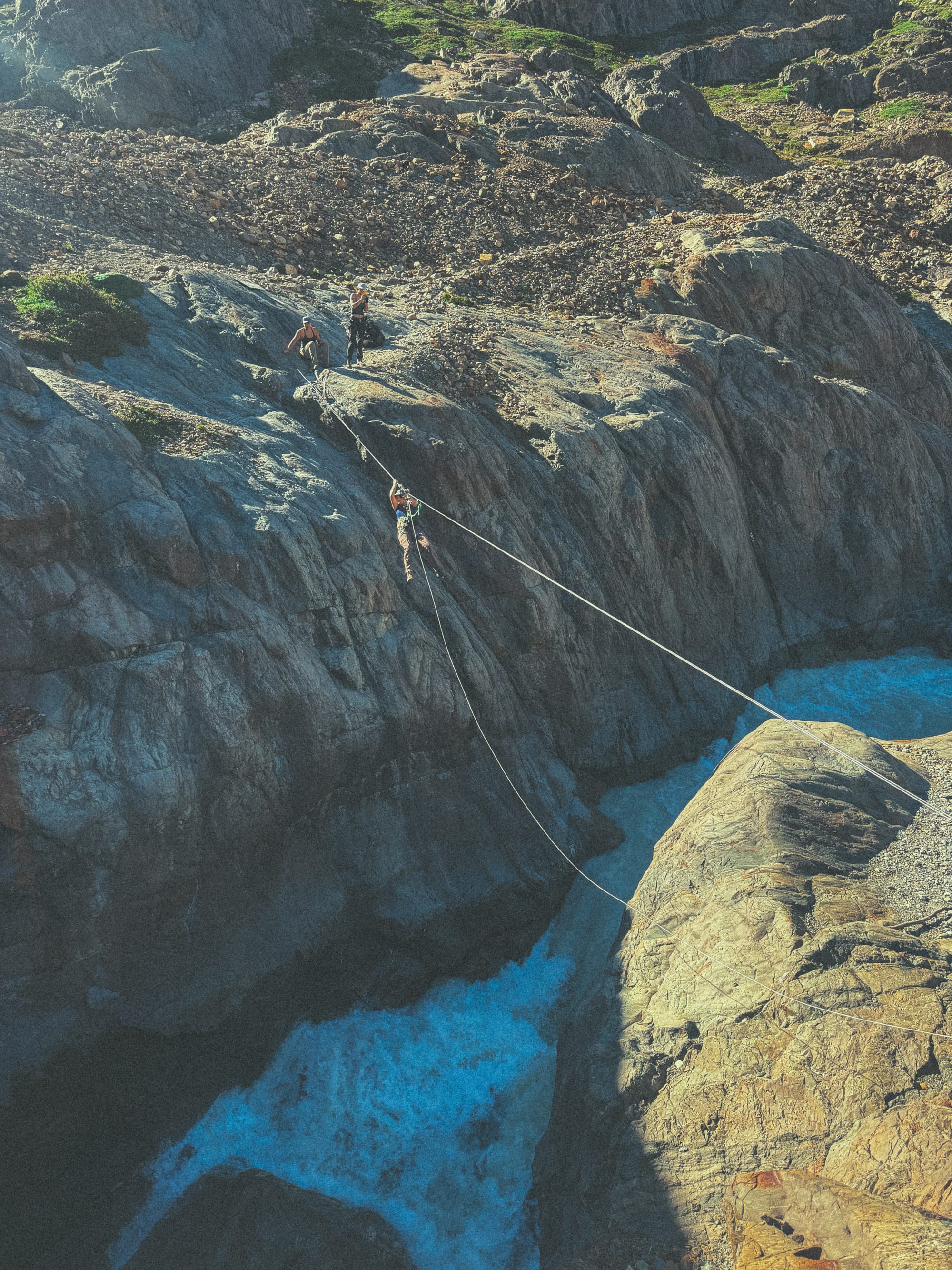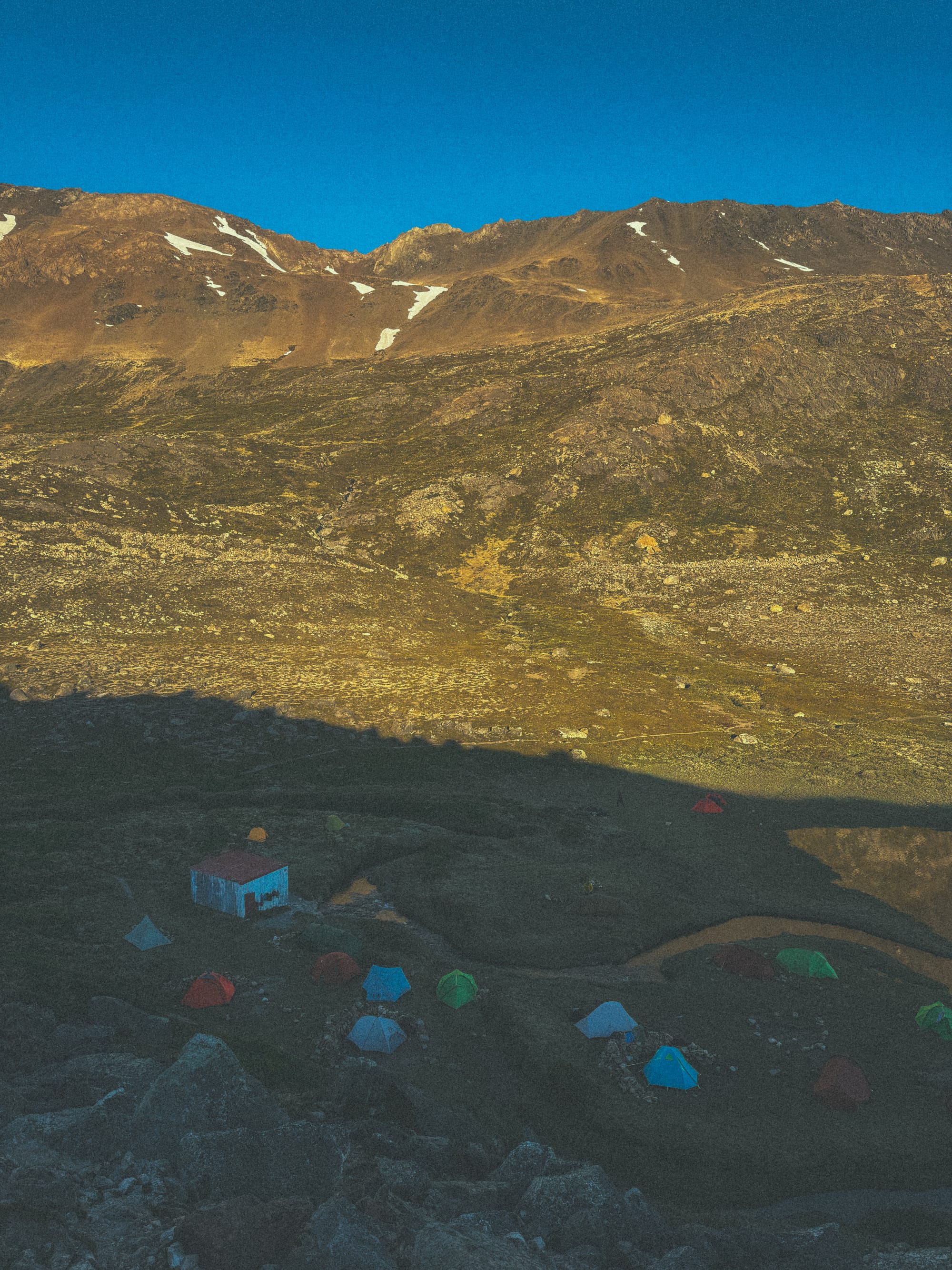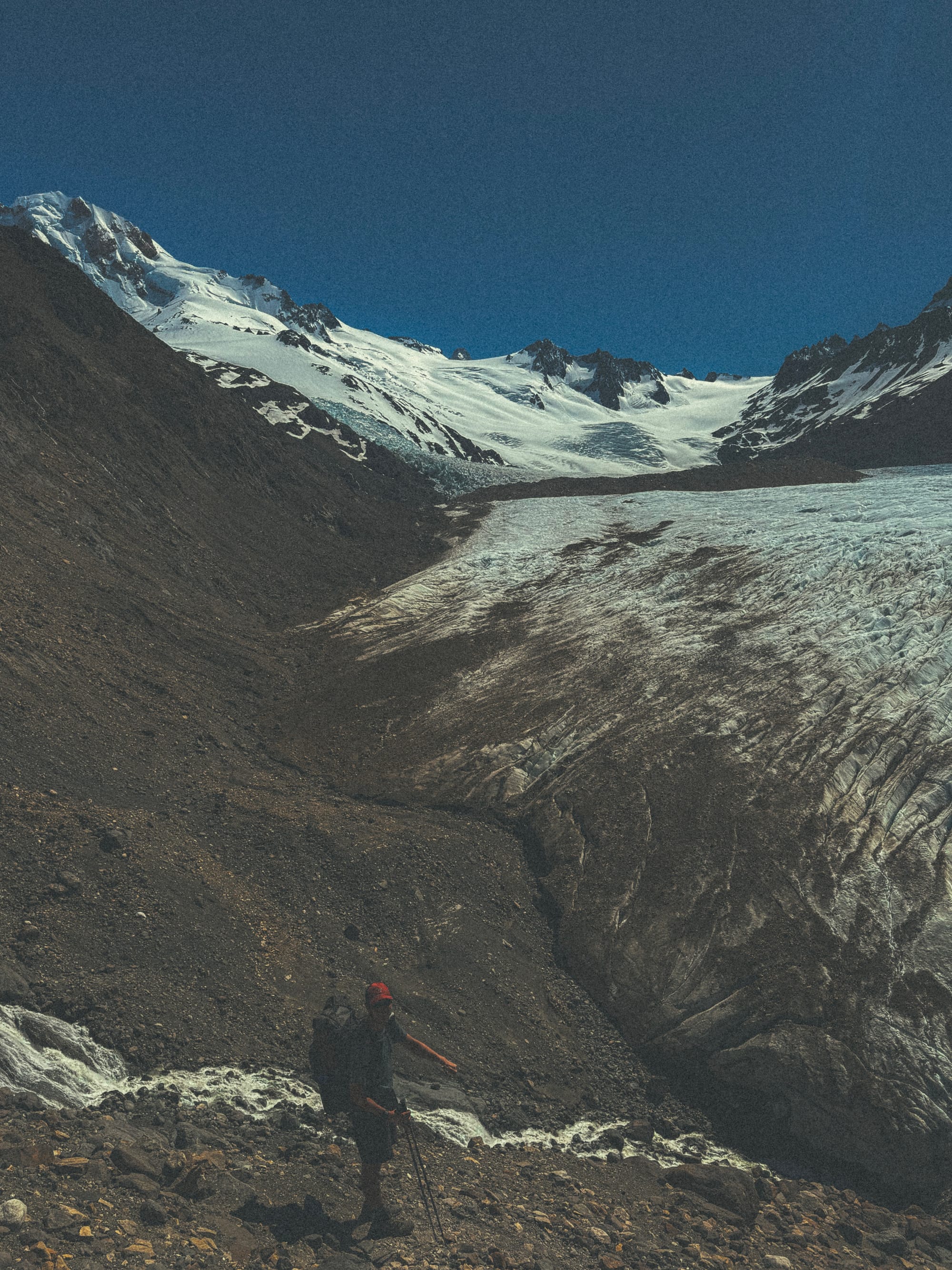 Day 2, 12km - The most technical day, after the first couple of kilometers I reached a river that needed to be crossed on a wire with a harness and pulley. You pull yourself and across the water that is rapidly flowing about 10m below. After this crossing the path goes up where you zig-zag between walking on and alongside Túnel Glacier. This section didn’t have a clearly marked path, and had lots of loose moraine that was quite difficult to walk across. Lots of checking with AllTrails to stay on the approximate path.