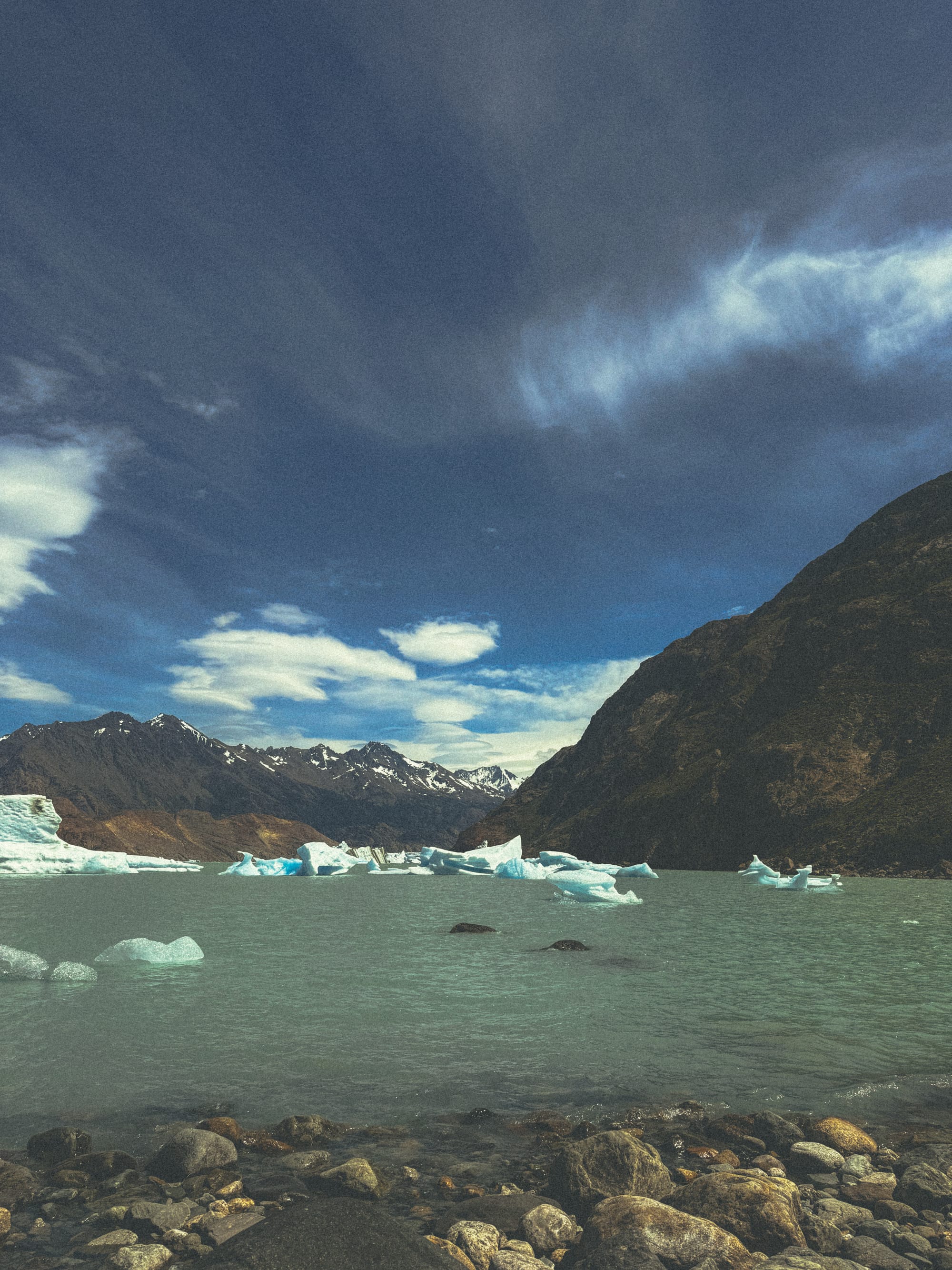 Day 3, 14km - The first 12km of day 3 is more walking adjacent to the ice field, amazing, unfathomly large in size, before a small incline up to another high pass. After this pass is a very steep, difficult descent (700m elevation loss in 1km) on very soft silty track. The reward for finishing this descent is the night 3 camp. Tucked in to a little bay of Lago Viedma, and next to the ice field, large chunks of ice break off and become icebergs floating in the lake. It was a surreal experience to swim next to these ice bergs. The walker with the temperature watch clocked this lake at a much warmer 9 degrees celsius.