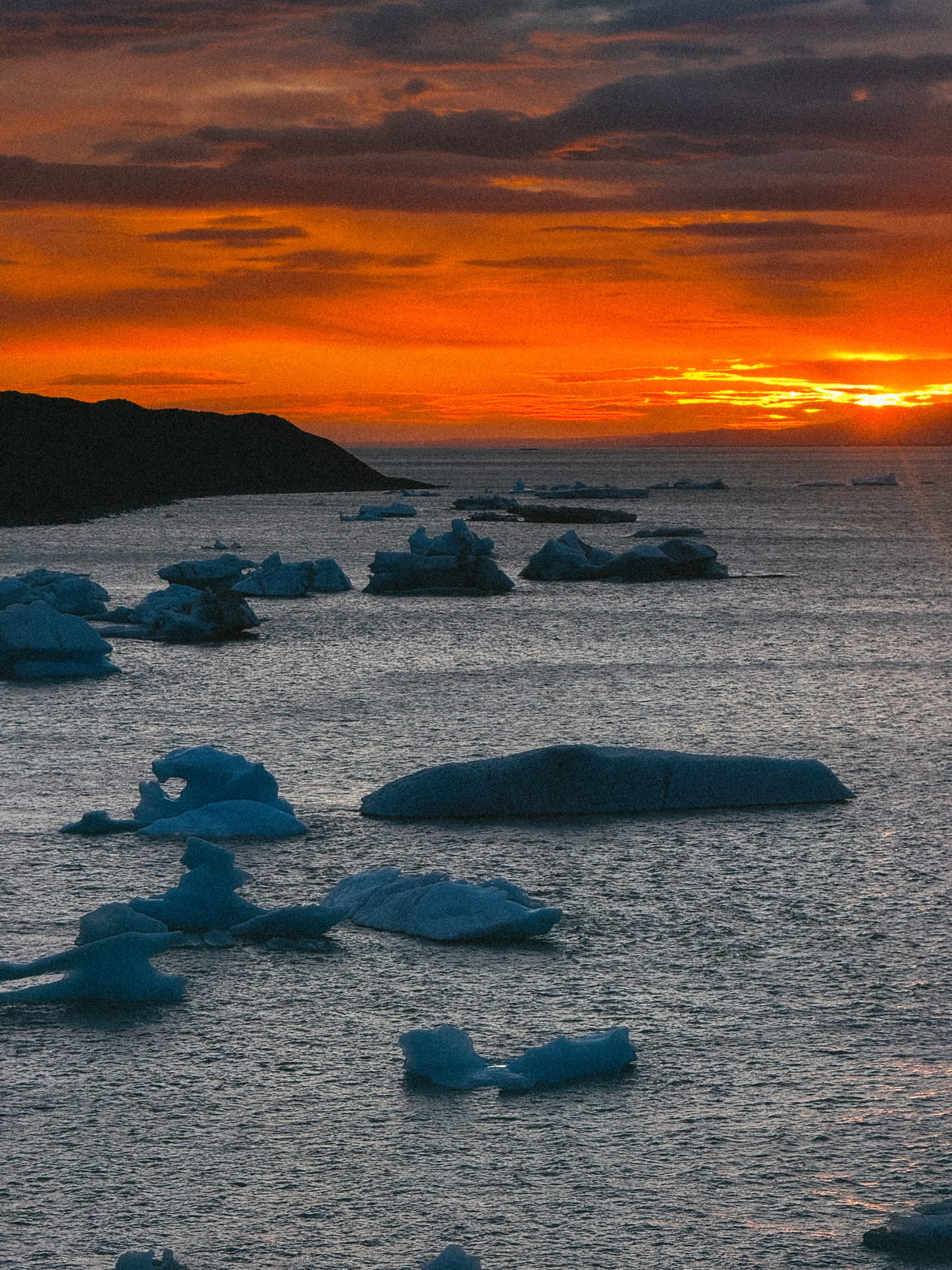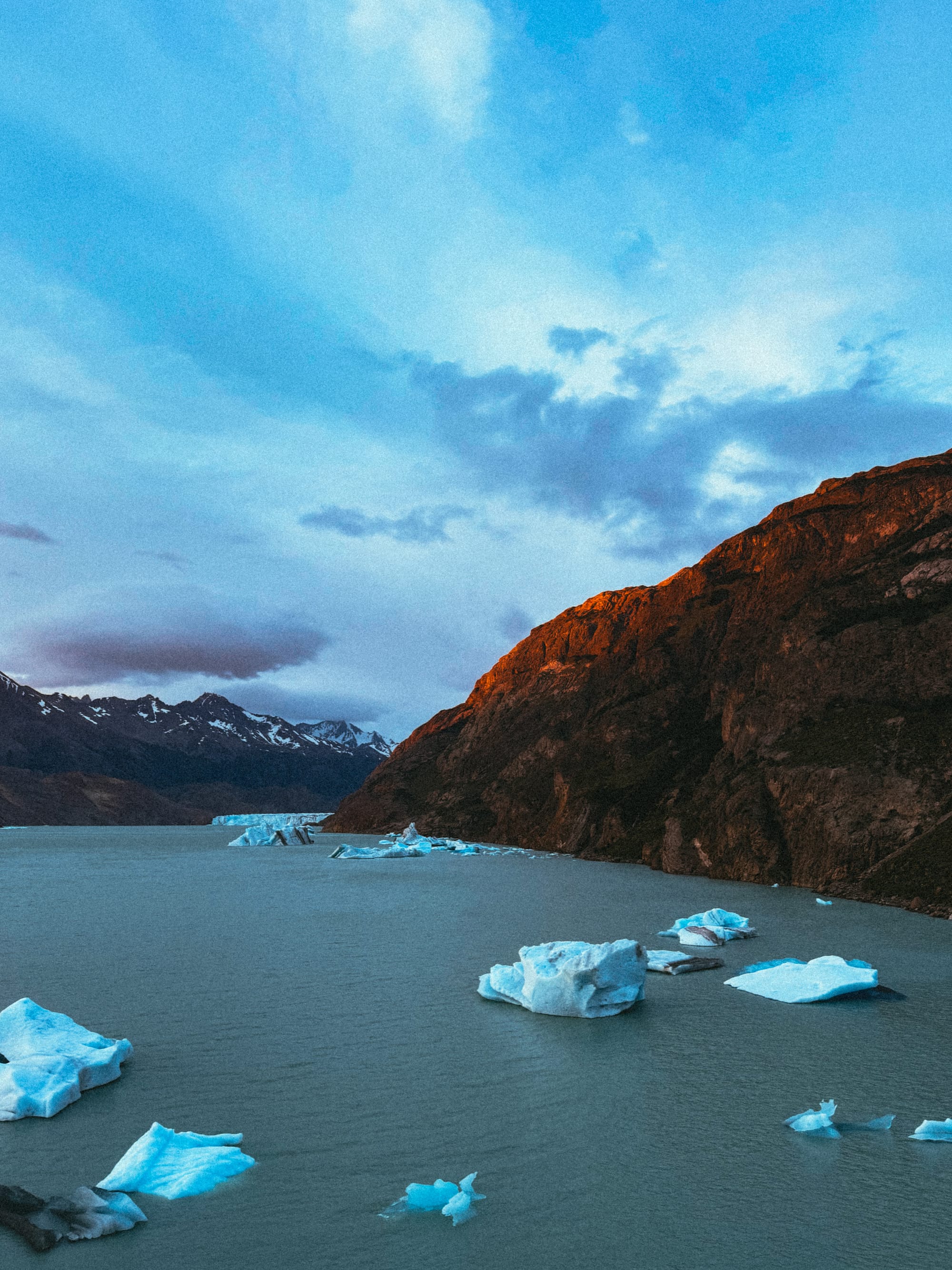 Day 4, 26km - It was an early wake up to see the sun rise over the lake. The early light hit the mountains next to the lake, making them glow a bright red. The orange of the sun hitting the white ice bergs in the water was a very pretty way to start the day. The final day is a long walk back to El Chalten, alongside the lake and across big fields. There were great views of where the ice field meets Lago Viedma and the surrounding mountain peaks. 16km into the walk was another wire/harness river crossing. The last couple of hours of walking saw the perfect weather window coming to a close as the wind picked up and cloud started to cover more and more blue in the sky.