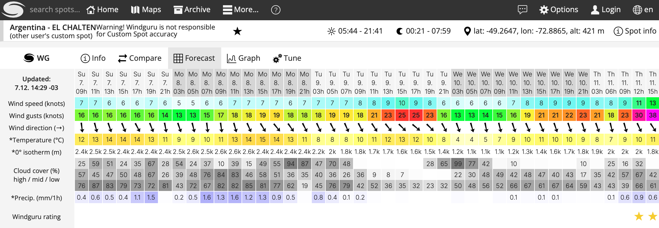 El Chalten is right in the heart of Patagonia. The weather here is wild. Think of the way you can get four seasons in one day in Tasmania or South Island New Zealand, and take it up to another level. Clouds sit at all different heights in the sky and are pushed around by the strong winds. Multiple days can go by where clouds obscure some, or all of the view of Fitz Roy. Seeking out good weather windows is everything for any hiking or climbing missions. Weather forecasting is a fickle exercise in Patagonia, but the collective knowledge agrees that the website WindGuru is the best hope at predicting what the coming days may have in store. WindGuru has quickly become one of my favourite sites, I like how much data you can read off of it quite quickly. Any BOM radar enthusiasts would enjoy having a look.