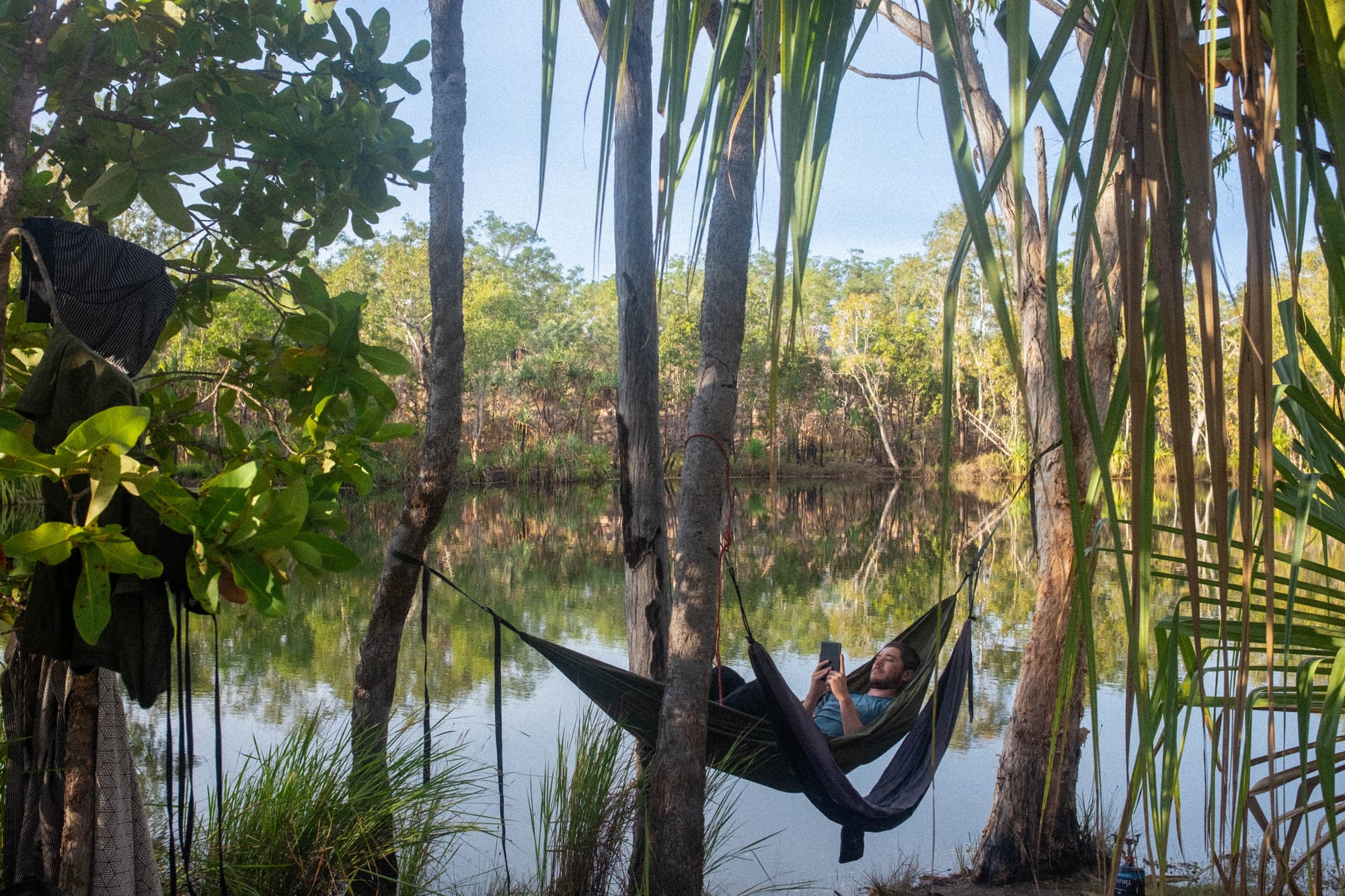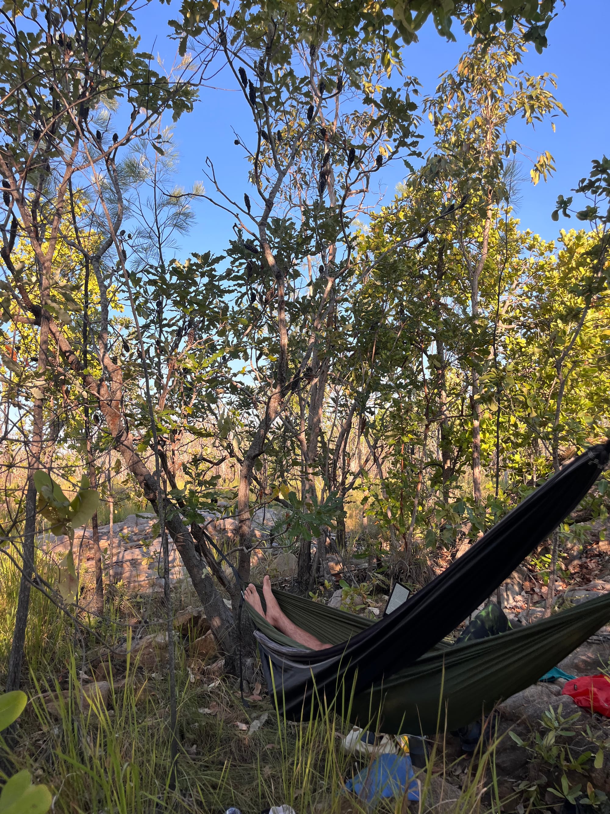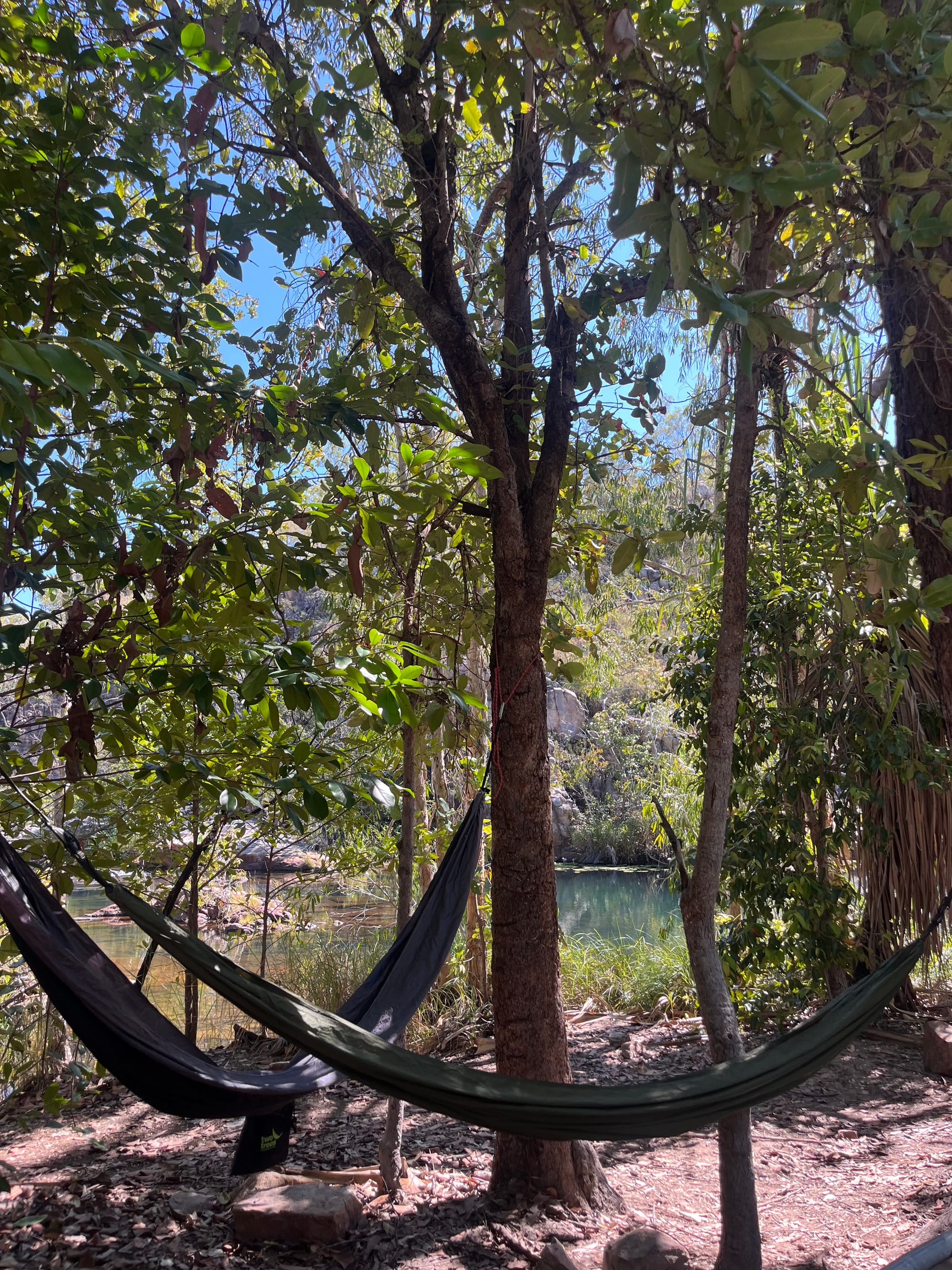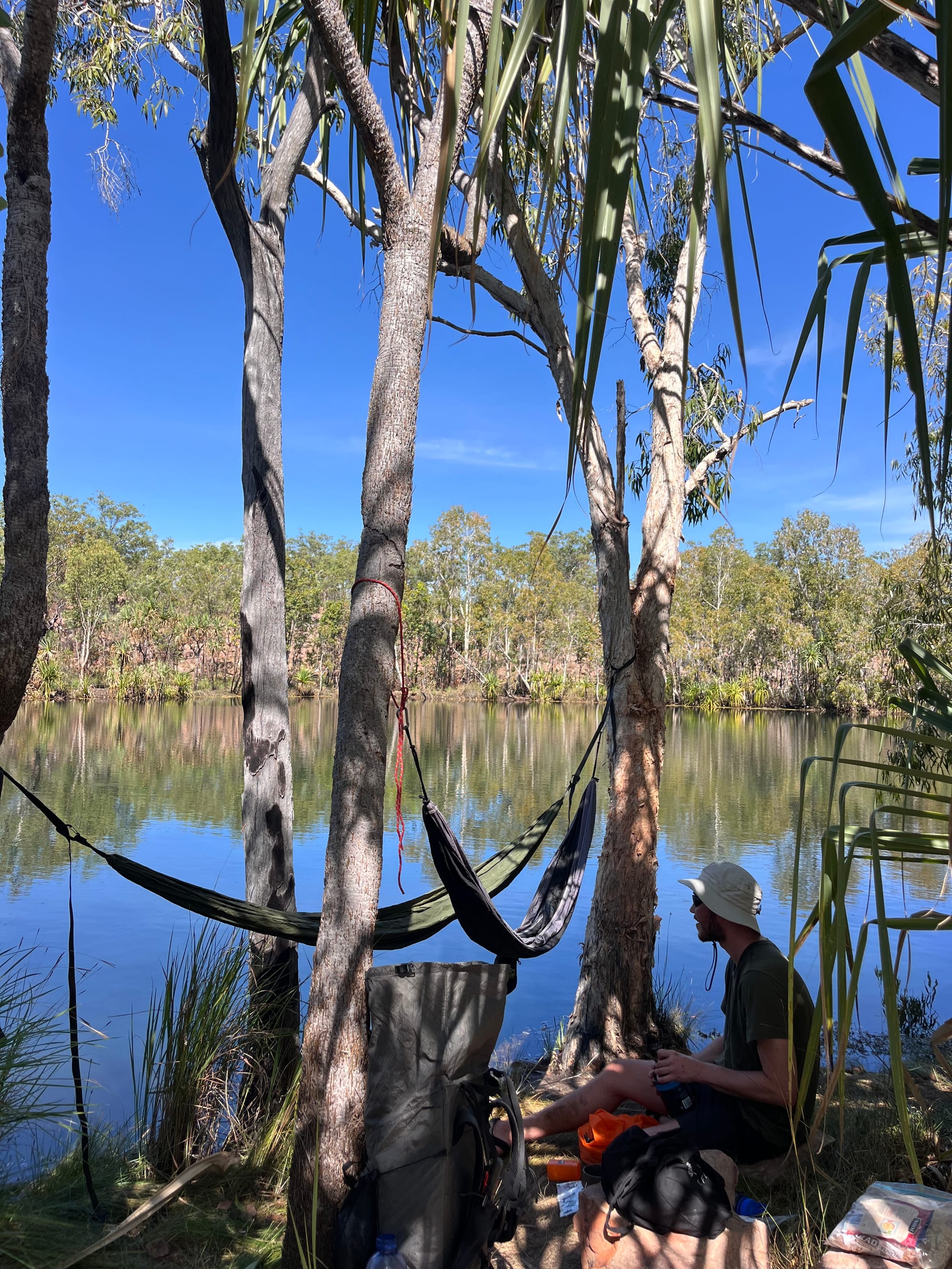 This was another shady, waterfront camp spot. The swimming spot at this camp was a large calm water hole, with a small waterfall cascade leading into it upstream. Prime hammock positioning here, with it almost hanging half over the water. The birdlife at this camp seemed to be particularly active, with many different birds gliding over and feeding in the waterhole throughout the afternoon.