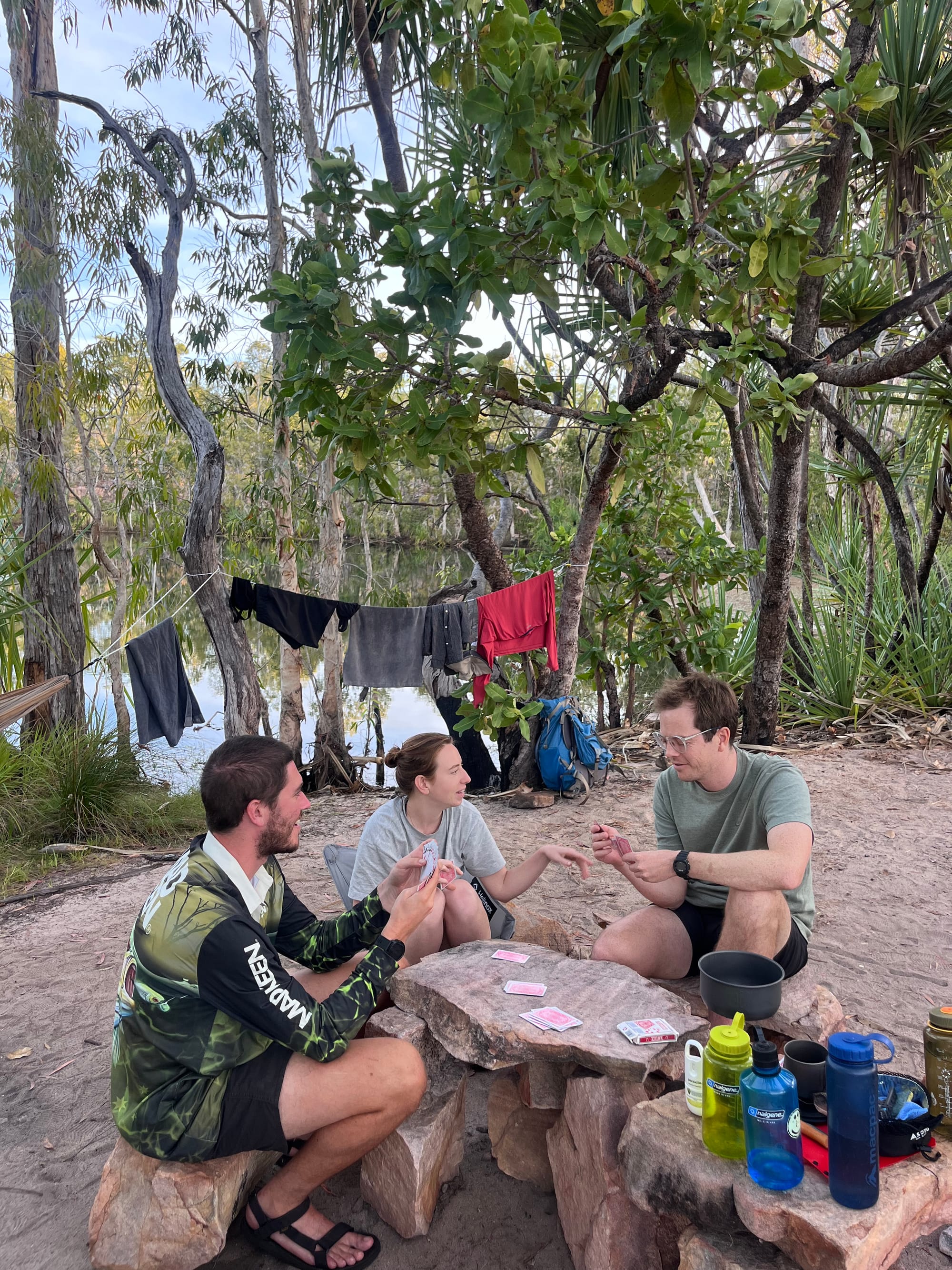 Crystal Falls was an approximately 30m wide, slowly flowing river. Where the camp was, large flat rocks stuck out from the water, creating little sections of faster flowing rapids in the water, and providing great spots on the rocks to sit or lay down. We spent the afternoon cycling between laying in hammocks and laying on these rocks in the middle of the river.