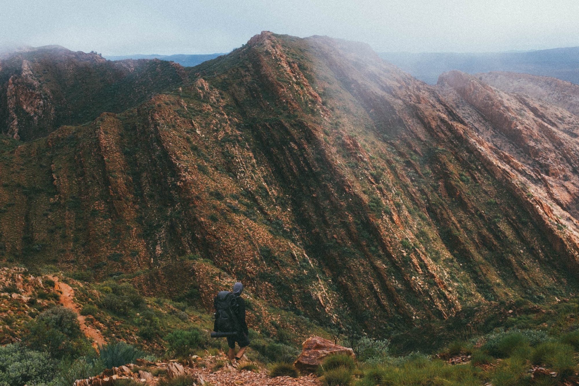 - Walking through some really big, sparse valleys, tall red mountain faces either side, misty and wet, very unique feeling, very special, vibes amongst group really high. Feels more like Red Tassie than the NT
