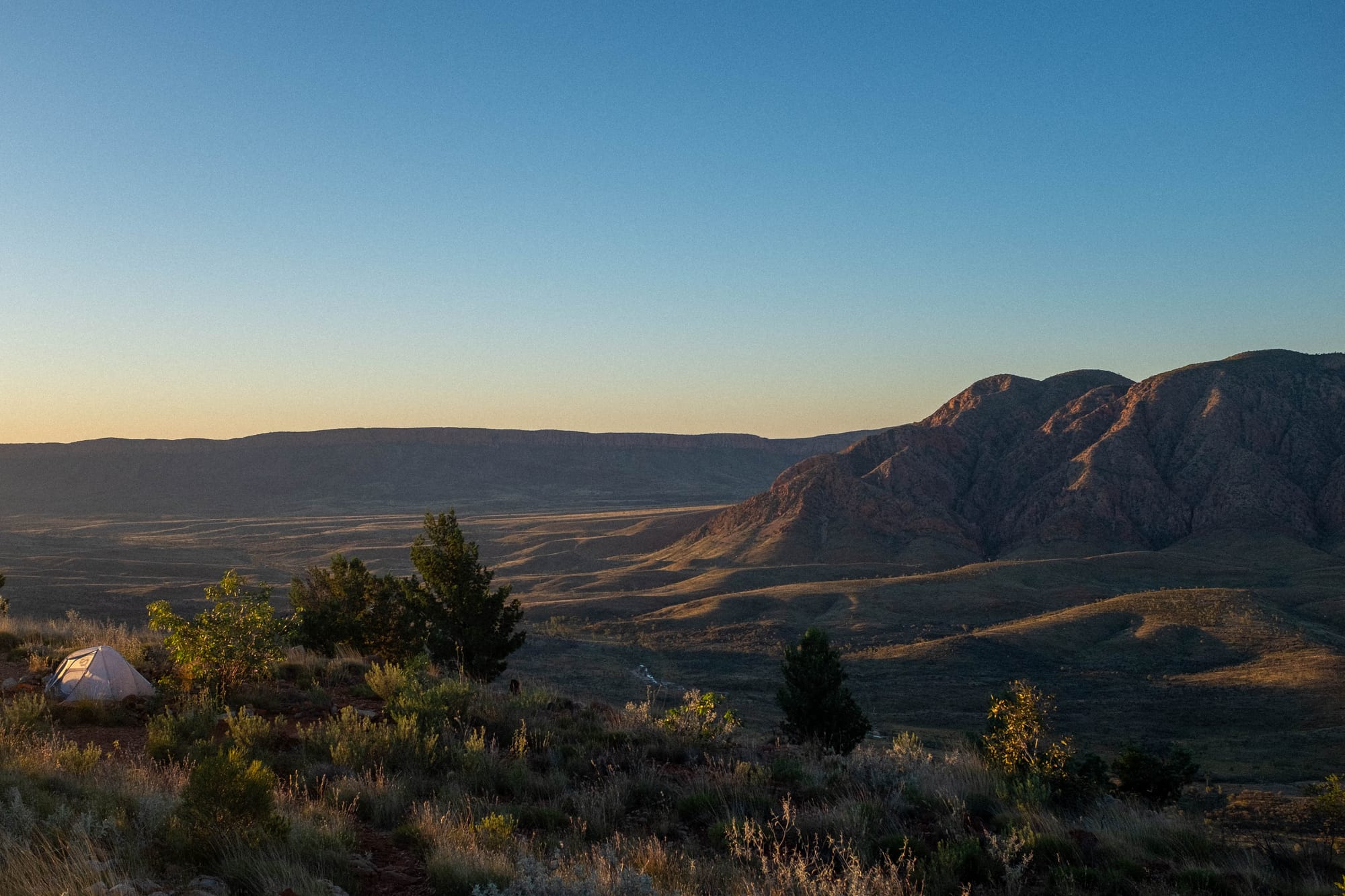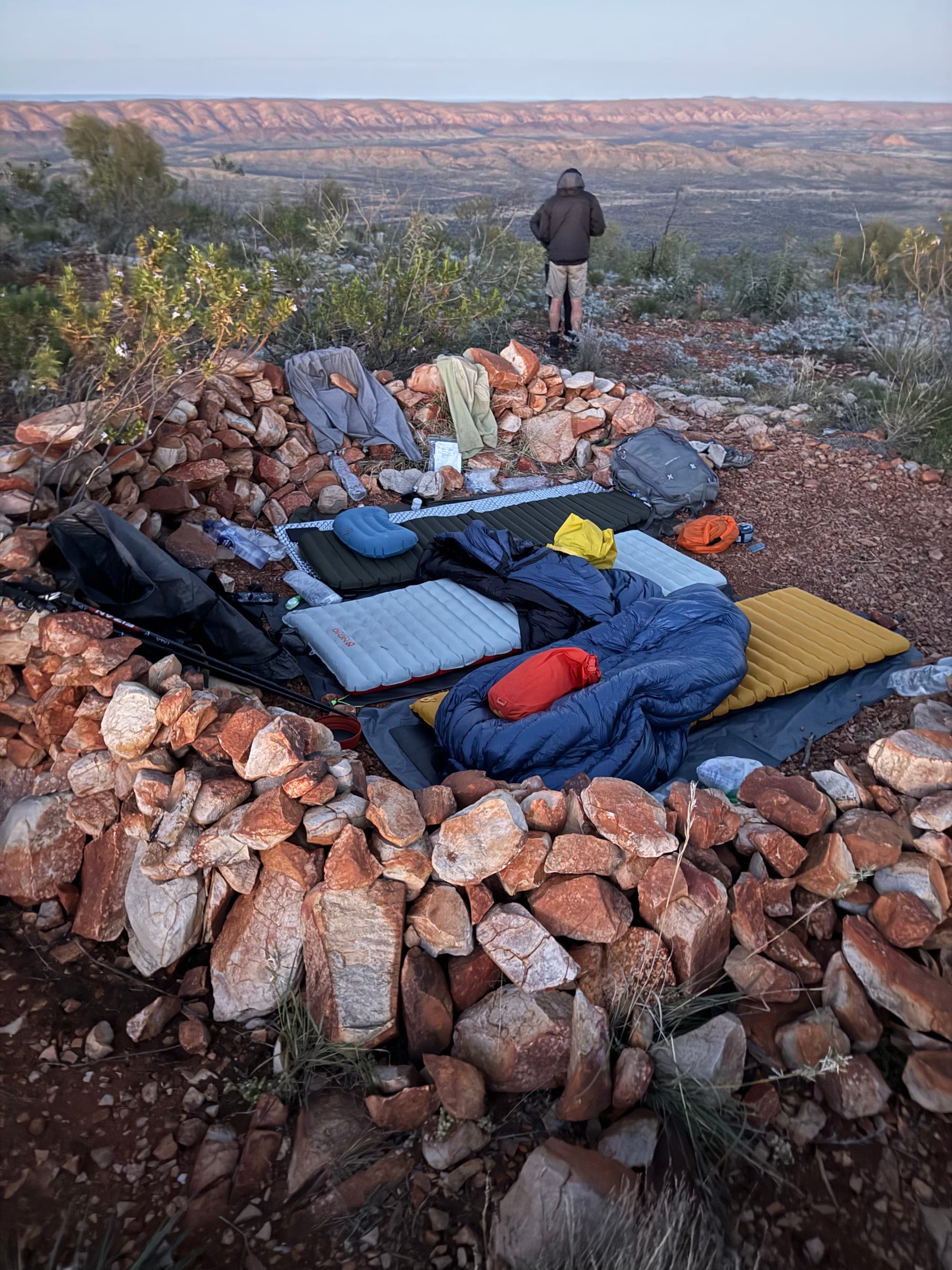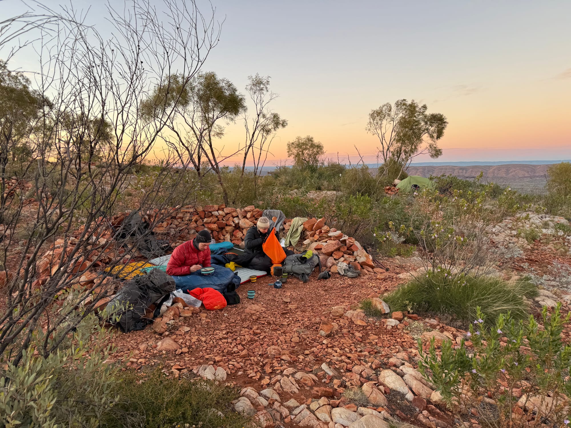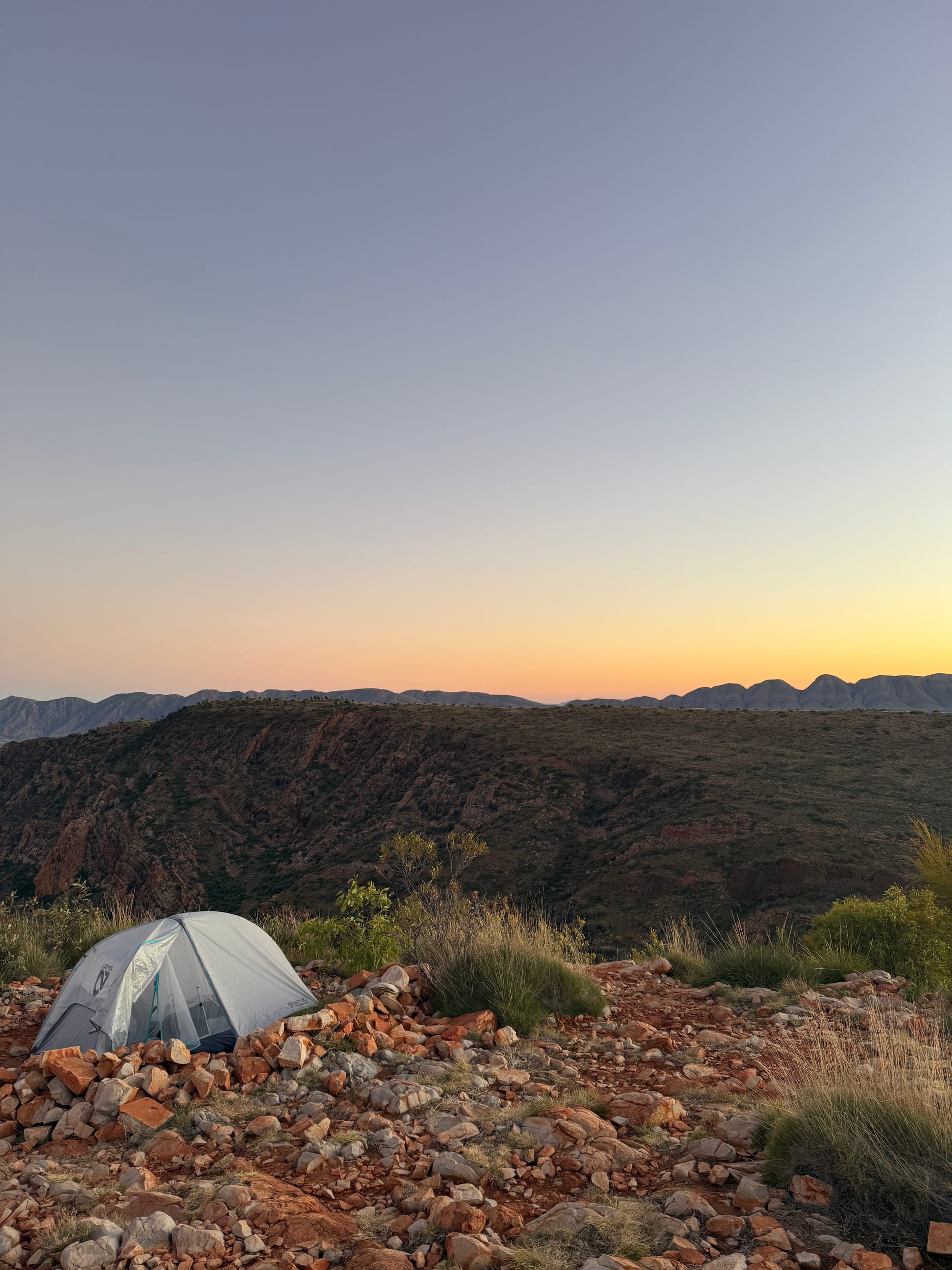 Cowboy Camping: Camping without a tent. Roll out a ground sheet, roll out your mat, roll out your sleeping bag and tuck into bed. This works well in the desert, as there is not much rain, it is never too windy, it is pretty dry so there aren’t many issues with dew, and there are no clouds, so the star show you get to look at each night is amazing. For our walk, Georgia went tentless and so cowboy camped every night. Hugh and I were keen to embrace being out in nature and so cowboy camped about half of the time. I have a pretty new tent and so I was keen to get some reps in in setting it up.