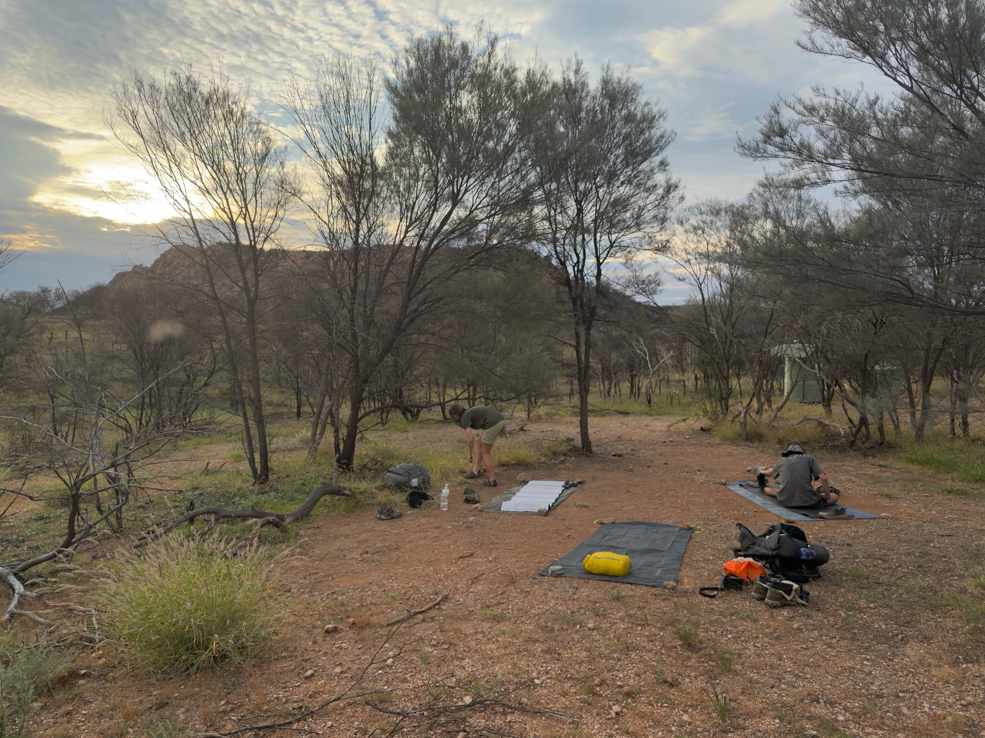 Low Camp: The Larapinta Trail is long and is broken into 12 sections. At each section junction (where one section ends and another starts) there is a shelter area with sleeping platforms (large wooden platforms underneath the shelter that you can pseudo-cowboy camp on), a couple of water tanks, a drop toilet, some normal campsites and a map that tells you some information about the trail on either side of the junction. While a lot of the walking on the trail was along, up and down the Western Macdonell Ranges, these shelter area campsites were always at the bottom of the mountain ranges in the valley. We referred to these shelter area campsites as low camps. Given the amenities they provide, and the even spacing of them across the trail, most walkers stay at the low camps each night. For the most part, the low camps were set up in cool locations, usually close to an interesting rock formation or a swimming spot. We camped at the low camps for about half of the time on trail.