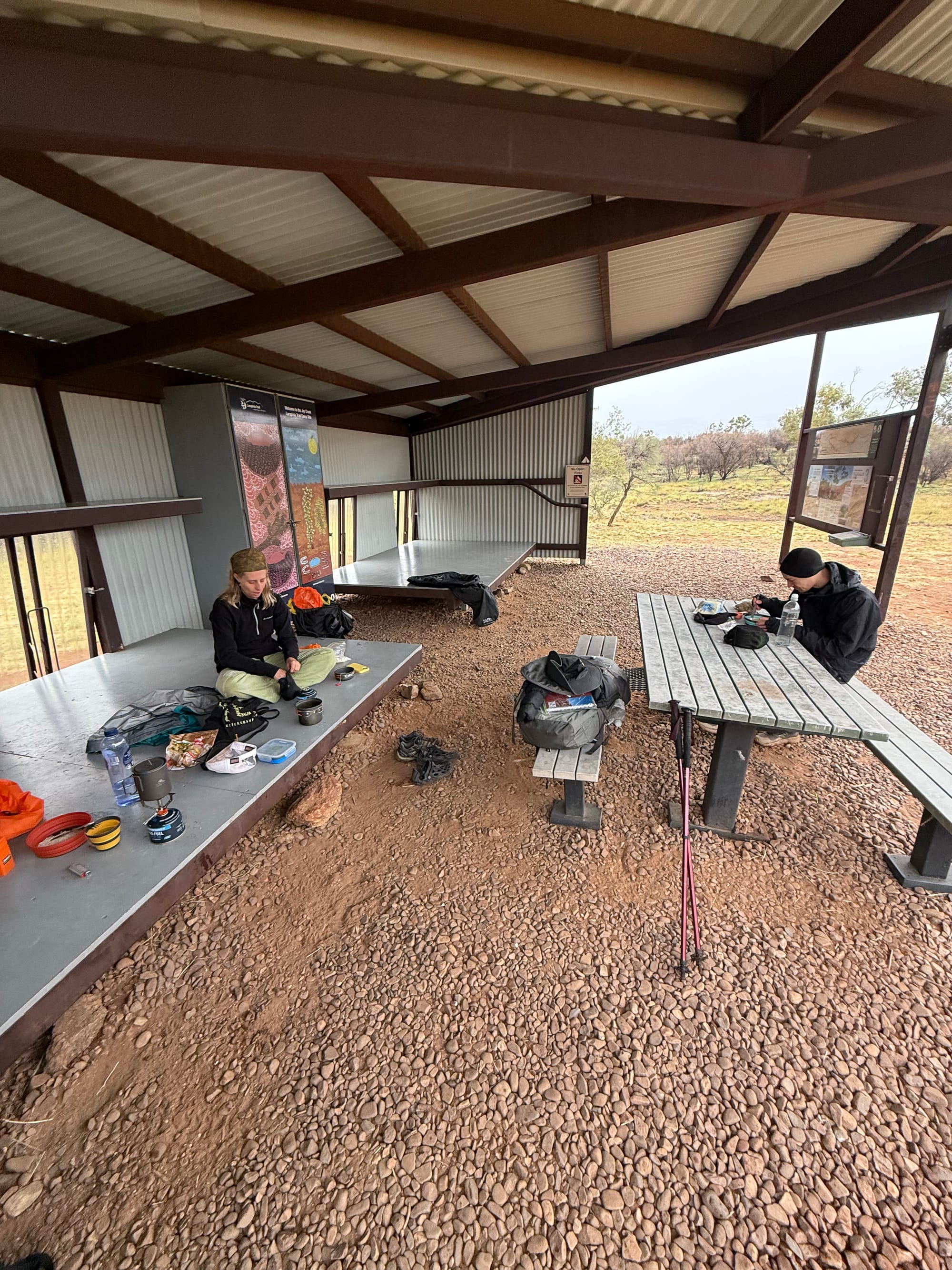 The volume of rain that came down that day meant that it was pooling around the slab of the picnic area, and after about one hour of sleep, it had breached the slab and began slowly flooding onto the slab. It reached Georgia’s sleeping spot, causing her to pivot to underneath a picnic table, a spot that was definitely not big enough for someone to comfortable sleep in, but was just about the only dry spot left under the shelter. As the night went on the rain and wind picked up again, blowing sideways enough to cover us all with a rainy mist that by morning had wet all of our sleeping gear. With another full day of rain forecast, all our gear soaked and morale starting to waver, we made some adjustments to our walking schedule on the fly, and bunkered down at Standley Chasm for all of day 4 to rest, eat more kiosk food, and dry out.