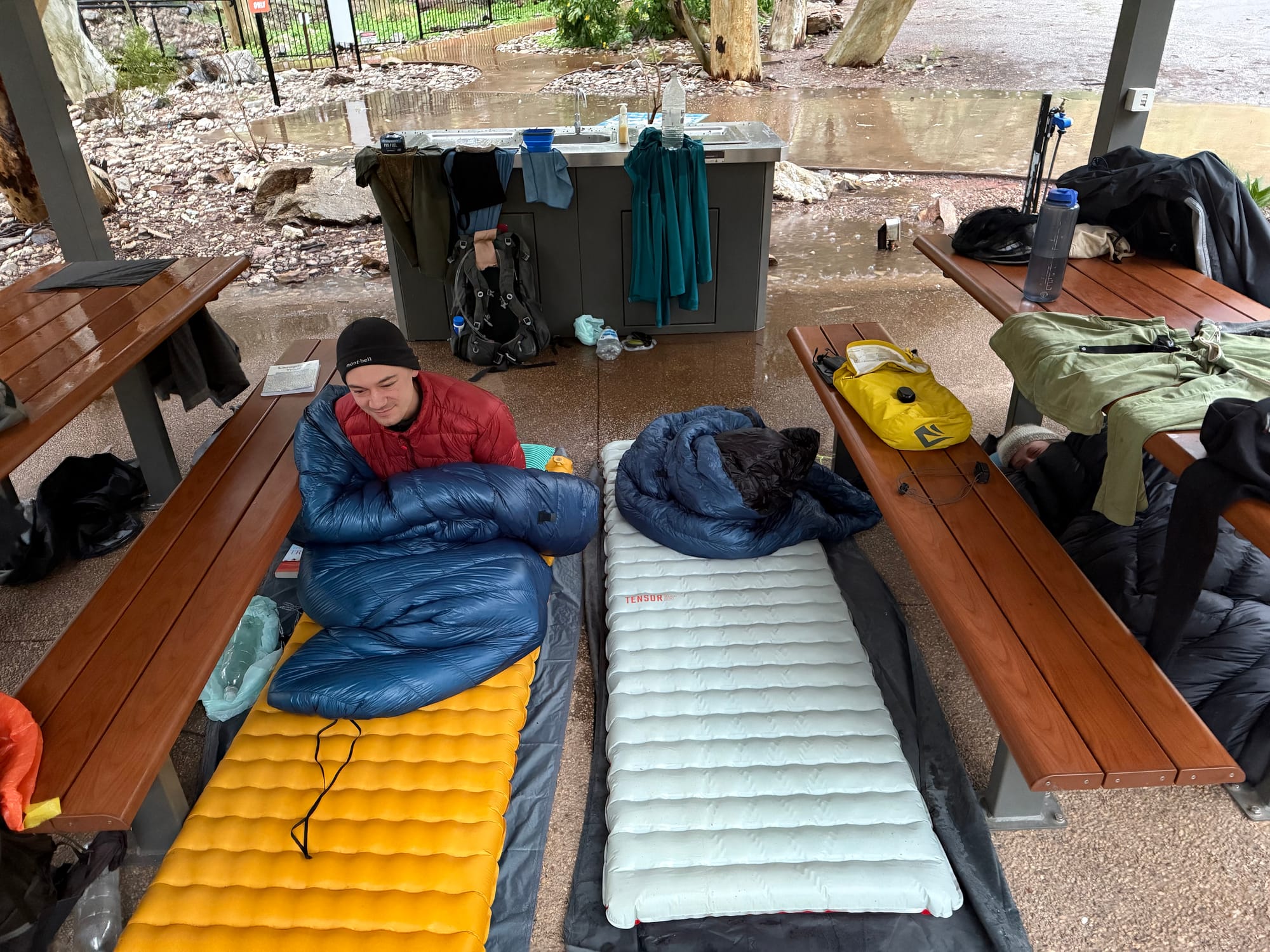 With hot food in the system and our gear starting to dry out, we couldn’t summon the energy to set up our tents in the pouring rain and face the wet again, so with the wind feeling pretty calm at Standley Chasm campsite, we made the call to cowboy camp under a picnic area shelter that was big enough for the 3 of us. This was a bad decision.