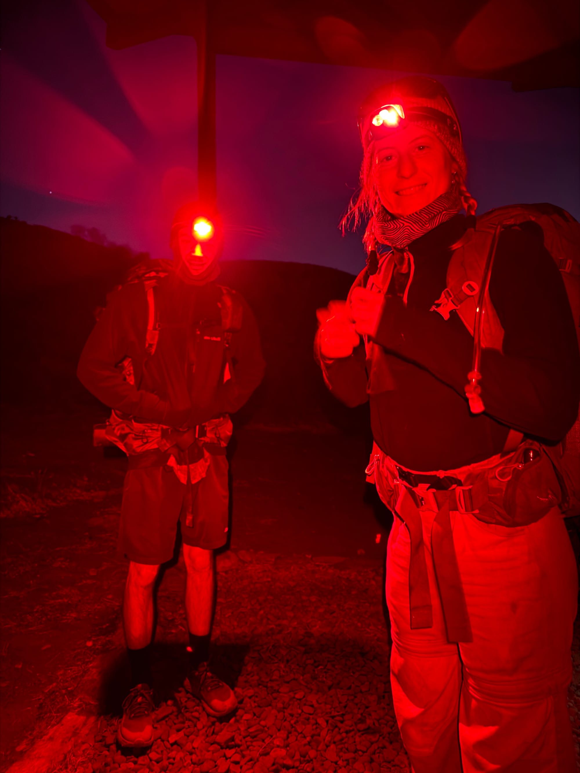 - 4:30am wake up as it was raining lightly, 5:00am packed up, quick coffee and snacks and started walking at about 5:45 in the dark with head torches on.