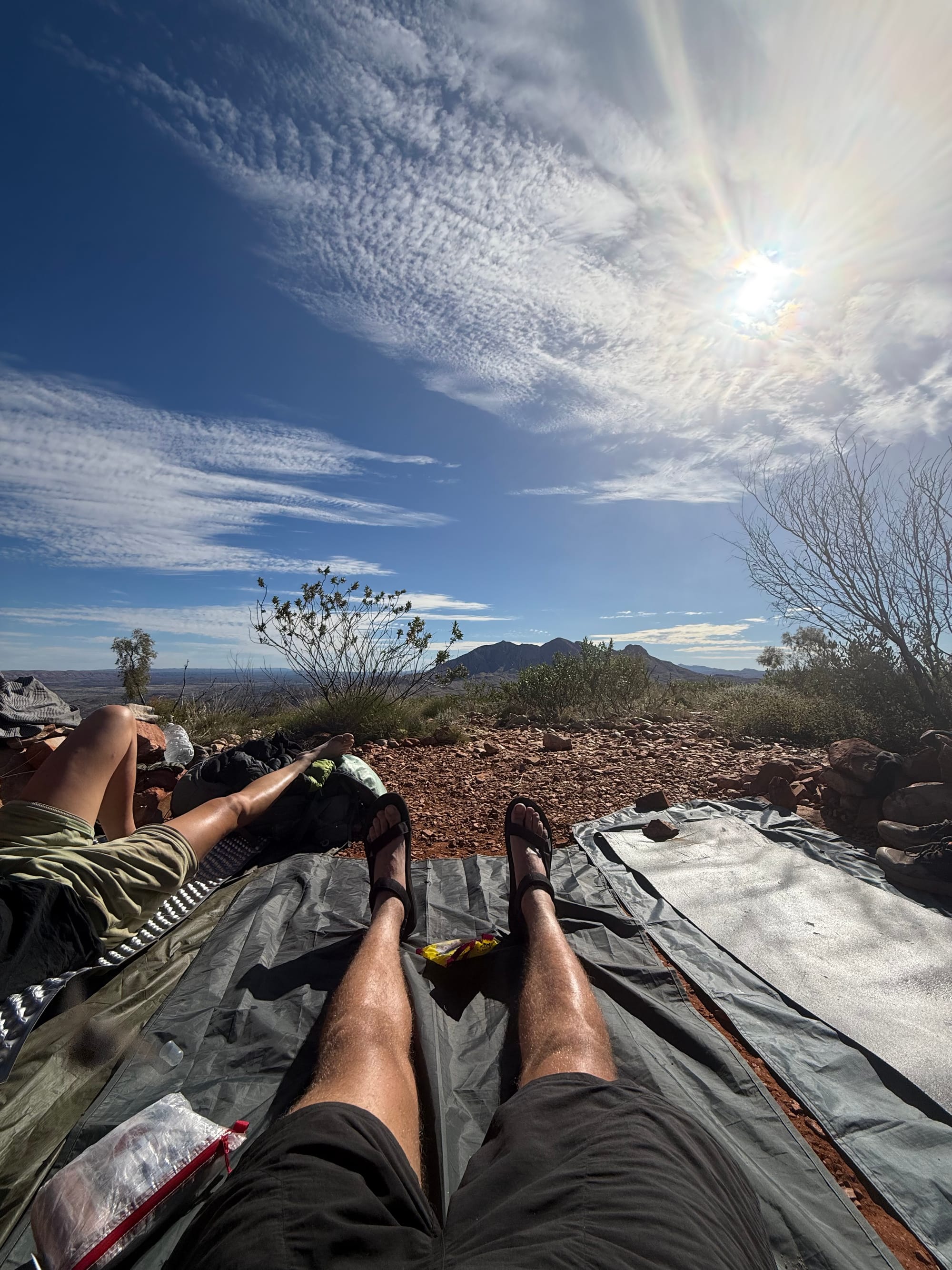 We claimed the largest tent spot we could find (which are always pretty small at the high camps) and committed to one last cowboy camp together for the trip. We laid out groundsheets, and lay around for the rest of the afternoon chatting, reading, napping. The peak of the afternoon was a few rounds of 'queue your favourite chill out song' (that you have saved offline). I think at this point it was Hugh who dubbed the afternoon the ultimate kickback, and I think he was right. The vibes were at an all time high! They just were.